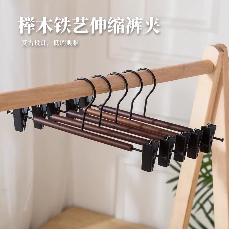 木のケヤキのズボンの棚の滑り止めの鉄芸のスカートの箪笥の家庭の服装の店の木製の傷のない高級なクリップのハンガー