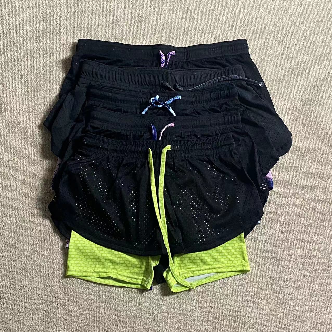 056DKフィットネスパンツ女性偽二層ネット糸抜き通気速乾ランニングレジャーヨガパンツパンツ
