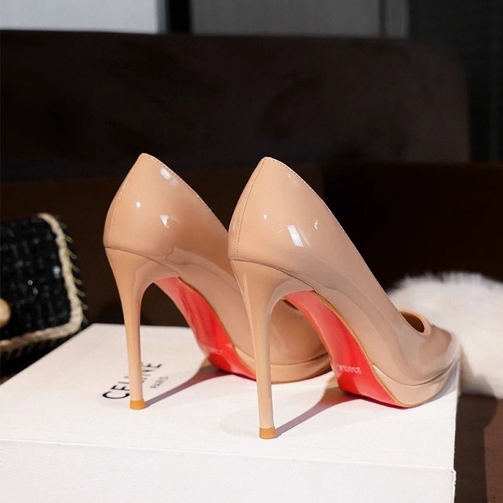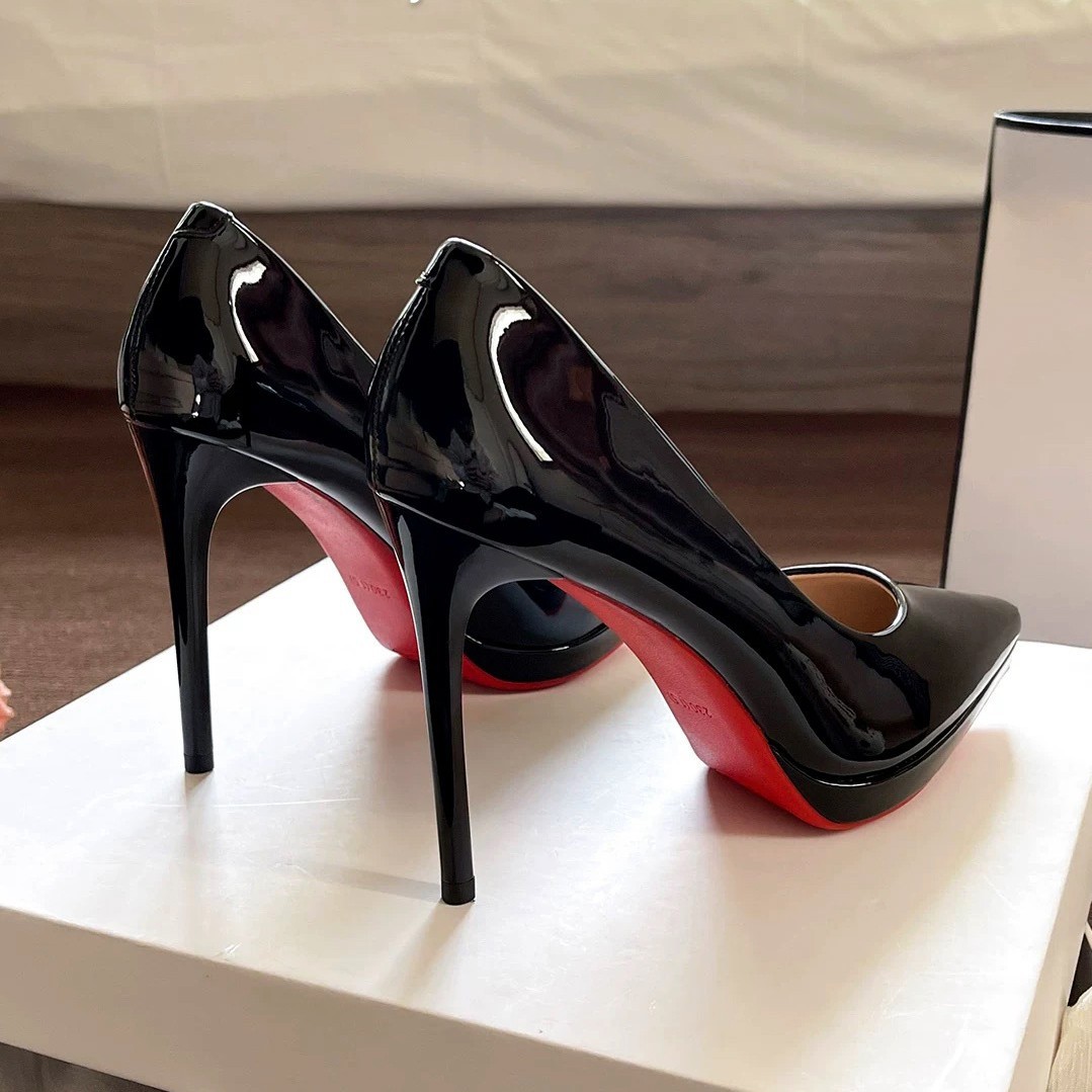 2025 新スタイルの美しいセクシーなパテントレザー黒赤底ハイヒールの女性の防水プラットフォームポインテッドトゥ疲れない薄いヒールの靴