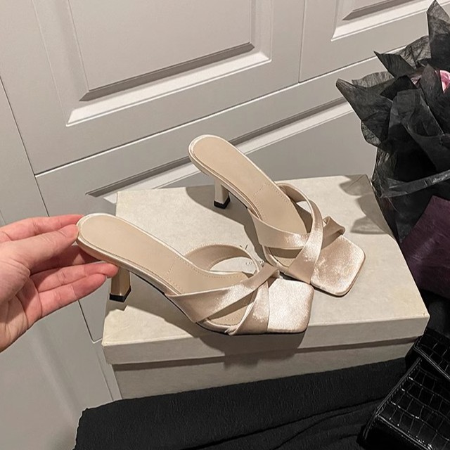 夏の新しいニッチクロススクエアトゥビーチサンダル女性の夏のアウターファインヒール妖精ハイエンドサテンハイヒールサンダル