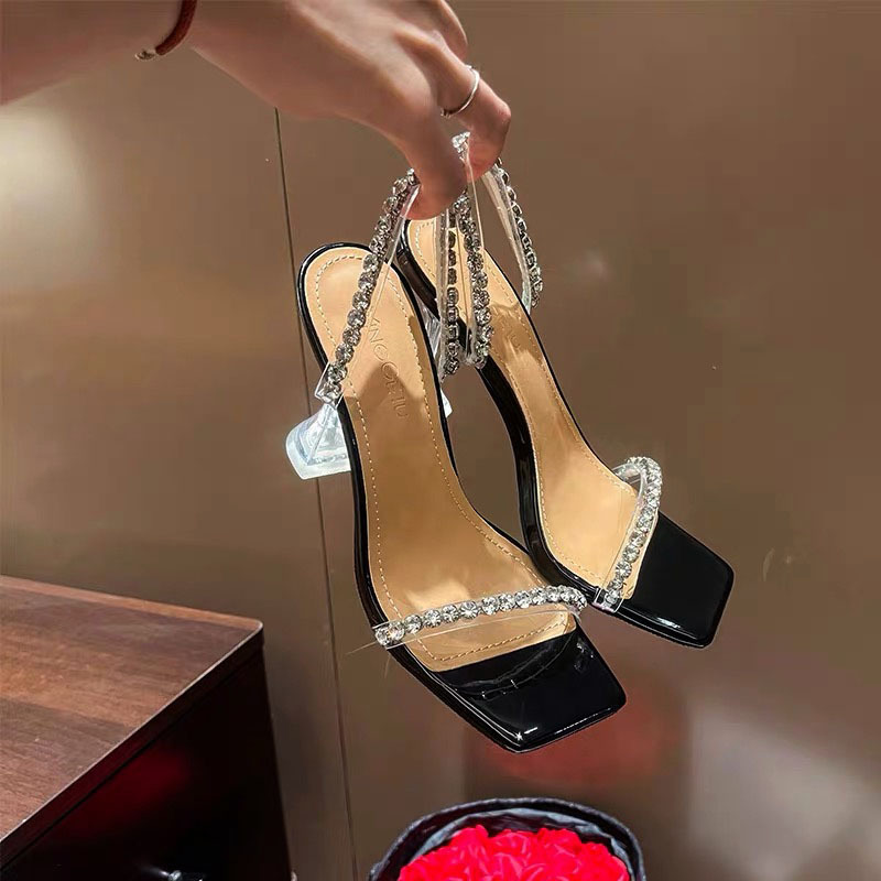 透明ハイヒールの太さと2025の新型水晶サンダルの外に女性の夏の銀色のドリルのサンダルの女性を着ます。