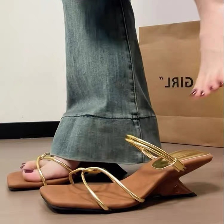 フランス式の2着の細い帯のローマのサンダルの女性の2025年の新型の1字の冷たいスリッパの女性の夏の外は坂のハイヒールを着ます。