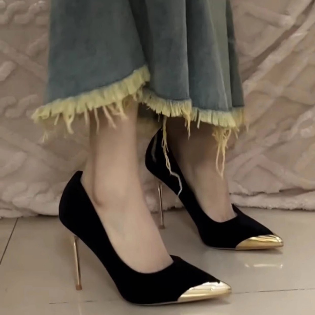 フランスの四角い頭の小さい人たちは蝶結びのミュラーとハイヒールのスリッパを着ています。