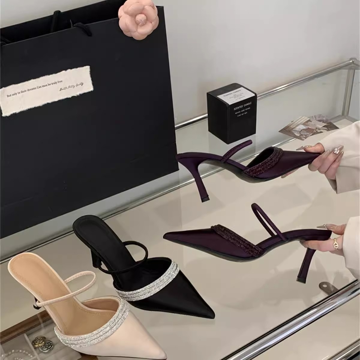 後ろの空の半引きサンダルの女性2025秋の新型韓国版の尖ったシルクの細いハイヒールのドリルの1字は包頭を持ちます。