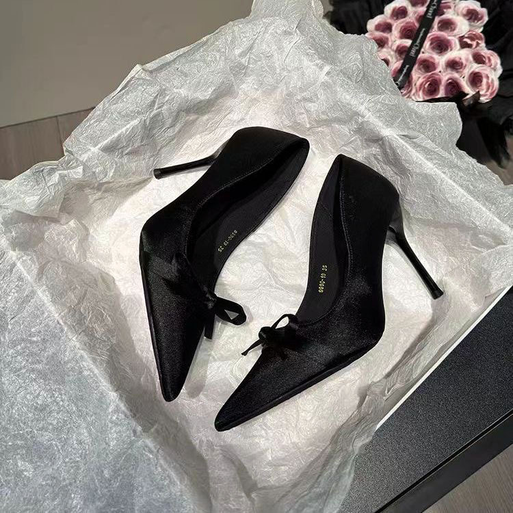黒い蝶結びのハイヒールの女性2025春の新型の尖った絹織物の気質の銀色の浅い口の細い靴