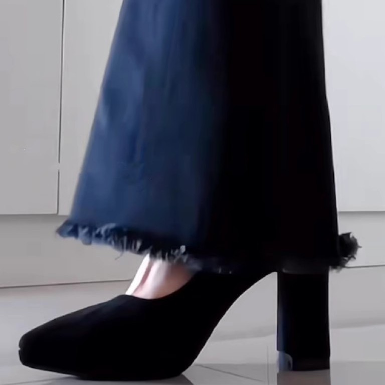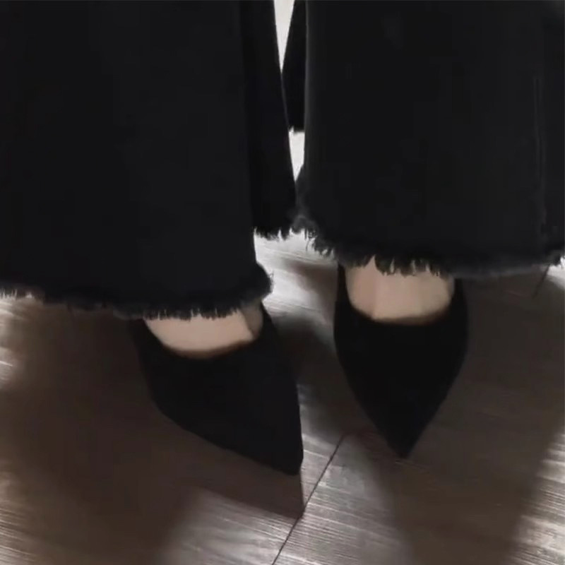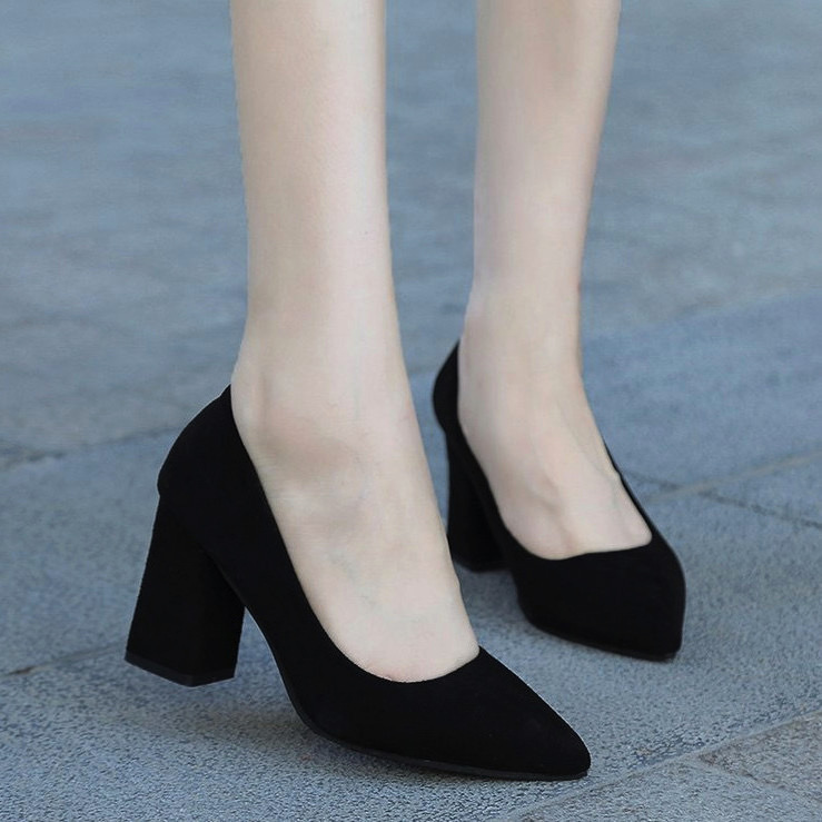 春と秋の新型の空乗靴韓国版の浅い口の先のスエードの黒いハイヒールの太さと仕事の通勤の面接の女性靴
