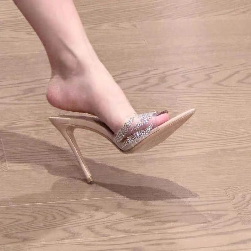 クリスタルスリッパの女性は夏にファッションアンドロメダのフランス式透明ハイヒールを履いています。
