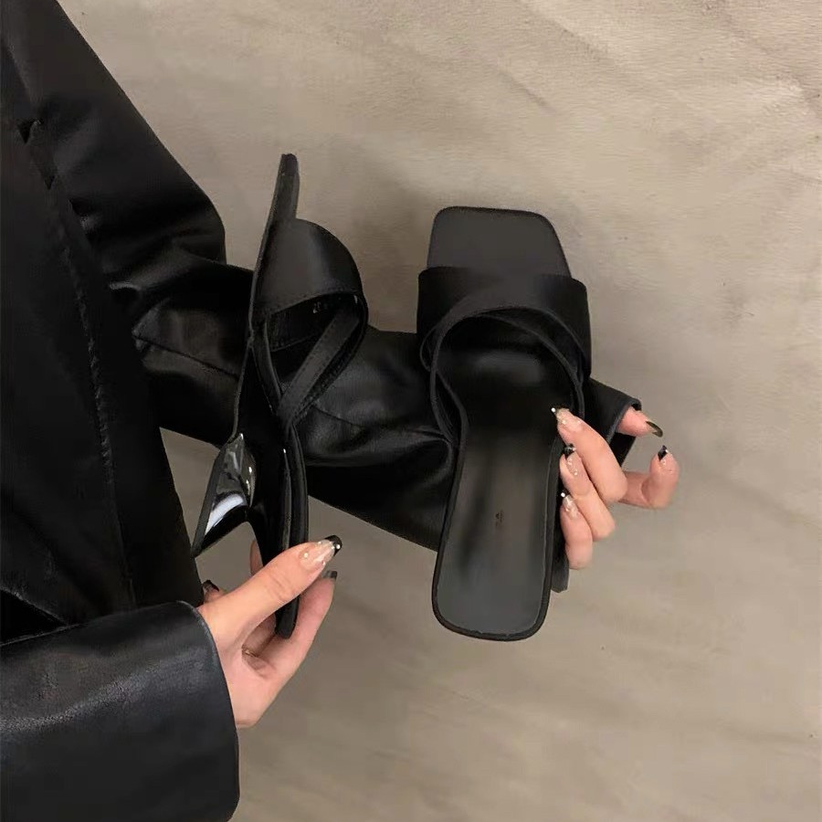 黒いサンダルの女性の夏2024の新型の細いヒールの先の高級感の絶美なセクシーな包頭の絹織物のドリルのハイヒール