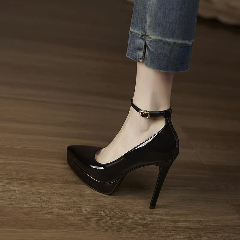 黒いハイヒールの女性2025の新型の先の細いとお姉さんの風のセクシーな漆の皮の復古の浅い口の靴は疲れません。