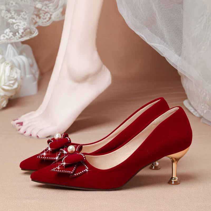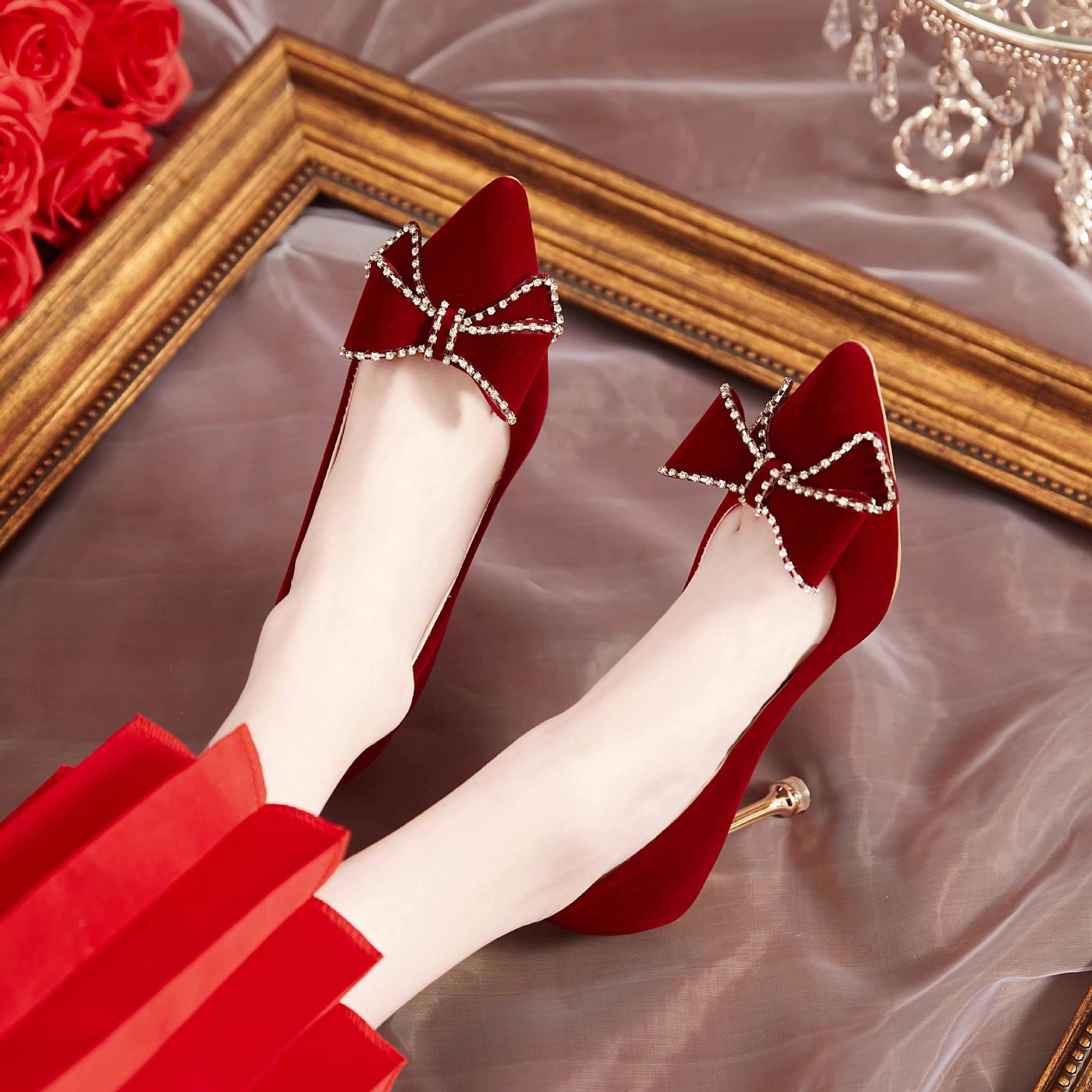 結婚靴の女性は2024年に新しい女性靴のワインレッドの細いハイヒールが疲れていない足の秀禾のウェディングドレスは花嫁靴を履いている