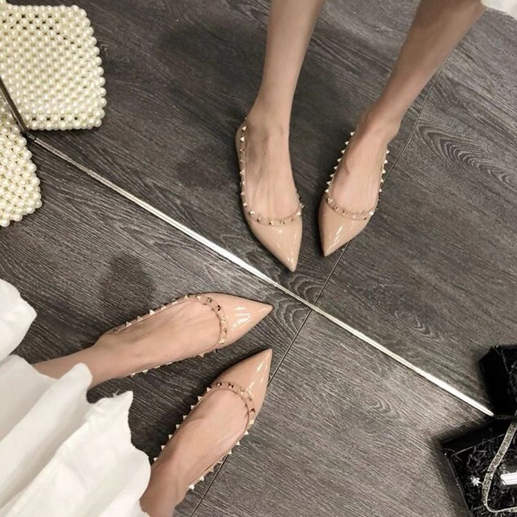 尖头铆钉单鞋女法式气质漆皮外穿柳丁瓢鞋晚晚风温柔裸色平底鞋女