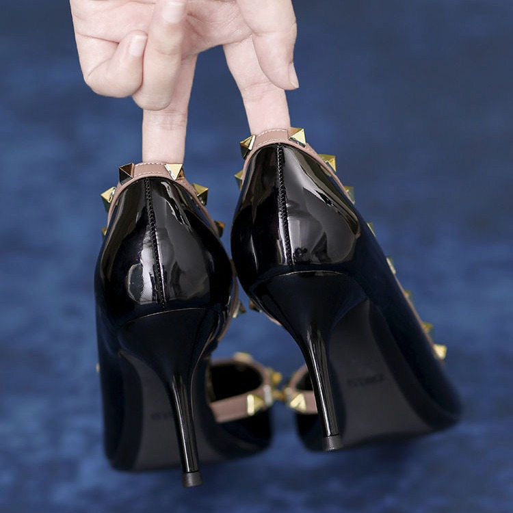 ハイヒールの女性2024リベットの新しい先端のセクシーな裸の側の空の靴の黒色の細いかかとの浅い口の包頭のサンダル