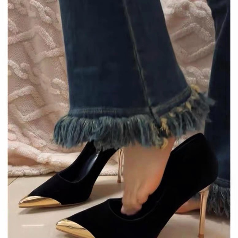 黒いスエードの金属のハイヒールの女性の細いかかと2025年の新型の宴会の高級感のお姉さんの浅い口の先の靴