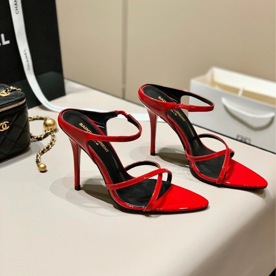 2024夏の新しい漆皮の赤いハイヒールの女性の先の細いかかとの1字のハイヒールのサンダルのセクシーな外は冷たいスリッパを着ます。