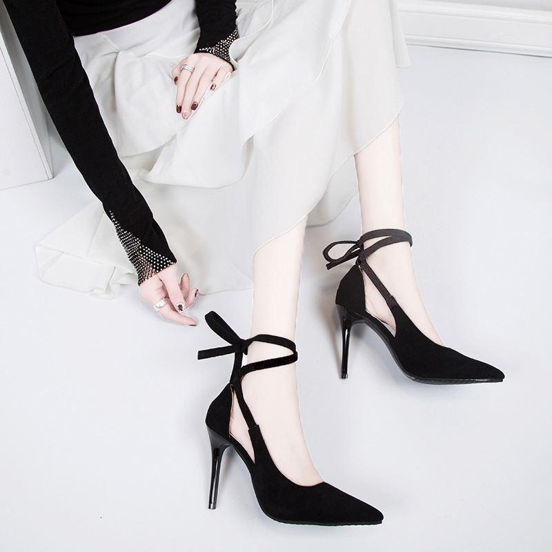 フランス風の雰囲気が細くて防水台の黒いハイヒールの一字のボタンがあります。
