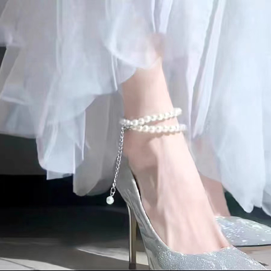 フレンチハイヒールの女性の細いヒールの6cm8クロスの銀色の真珠のチェーンの足の環の芸は成人の贈り物の1字のボタンをつけて結婚の靴を持ちます。