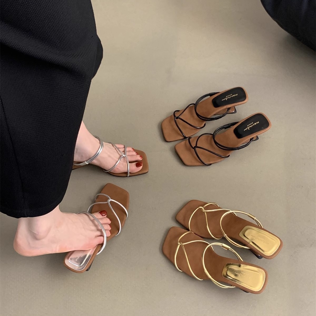 一字は洋風の金色の異形とフランスの気質のサンダルの女性のタイプ2025の新型の外は夏のハイヒールのスリッパを着ます。