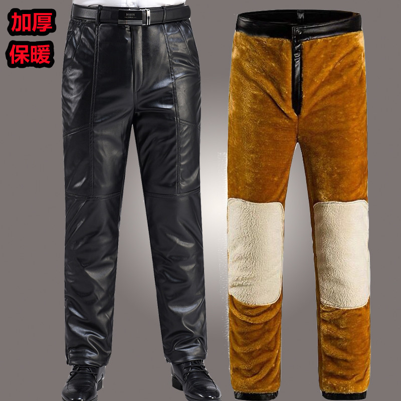 中高年冬の皮ズボン男とベルベットはバイクの保温防風防水がゆるい膝保護腰puズボンを厚くした