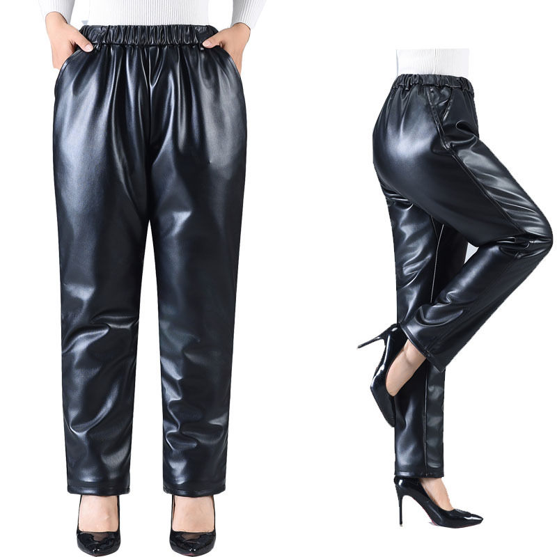 秋冬タイプの女性の皮のズボンの中で高齢者の高腰の黒いpuとベルベットの厚いゆったりした大きいサイズの防風の油のゴムのズボン