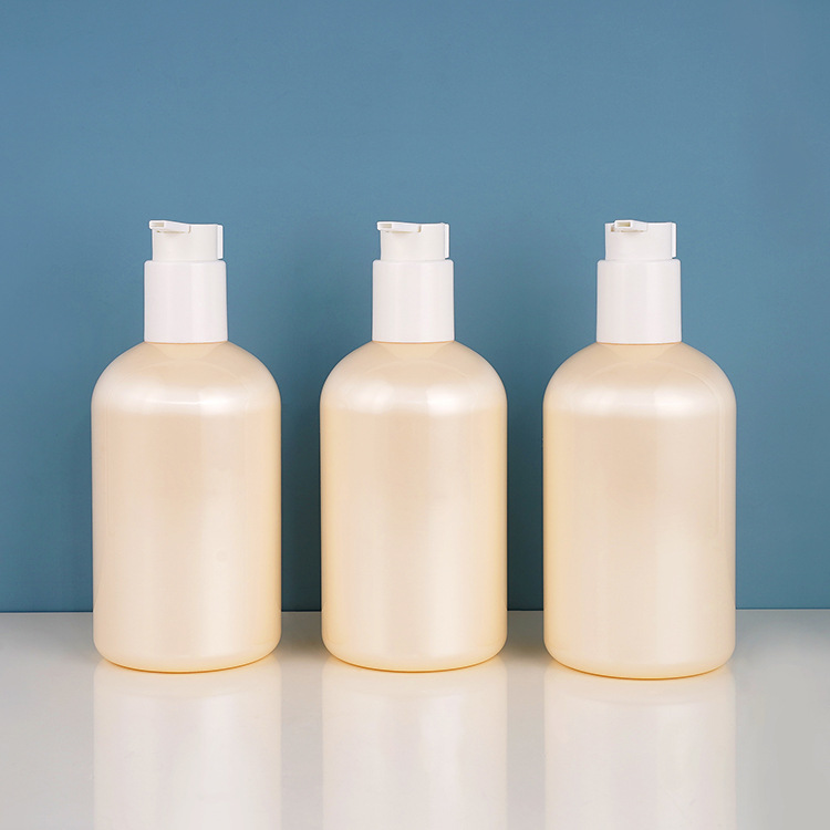 500mlの丸い肩のpetの千秋の蓋の入浴剤の乳液の瓶の包装はポンプの頭を押して肌の水の旅行を爽やかにして瓶を分けます。