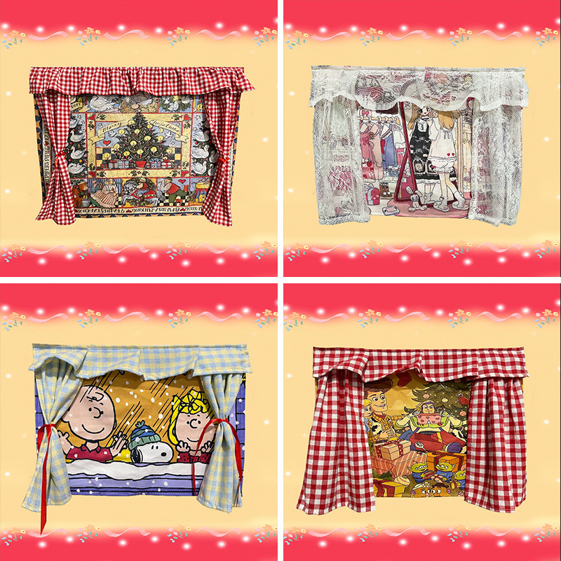 かわいい漫画のクリスマスの壁面の雰囲気の暗い赤いカーテンの寝室の背景の布のクリスマスの装飾の背景
