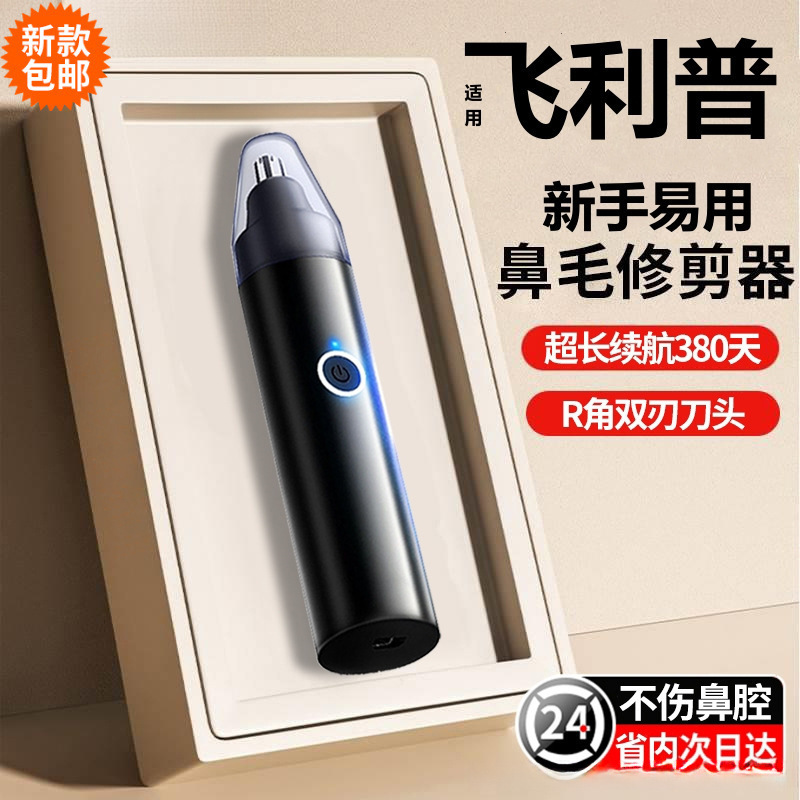 電気鼻毛の剪定器の男性はハサミを切って鼻毛器に行って鼻孔を剃ります。