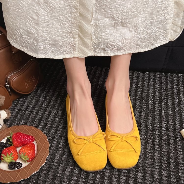 ベルベットの夜の風の優しい平底靴の女性2025の新しい蝶ネクタイの浅い口の柔らかい底にはミルク靴の瓢箪靴が入っている