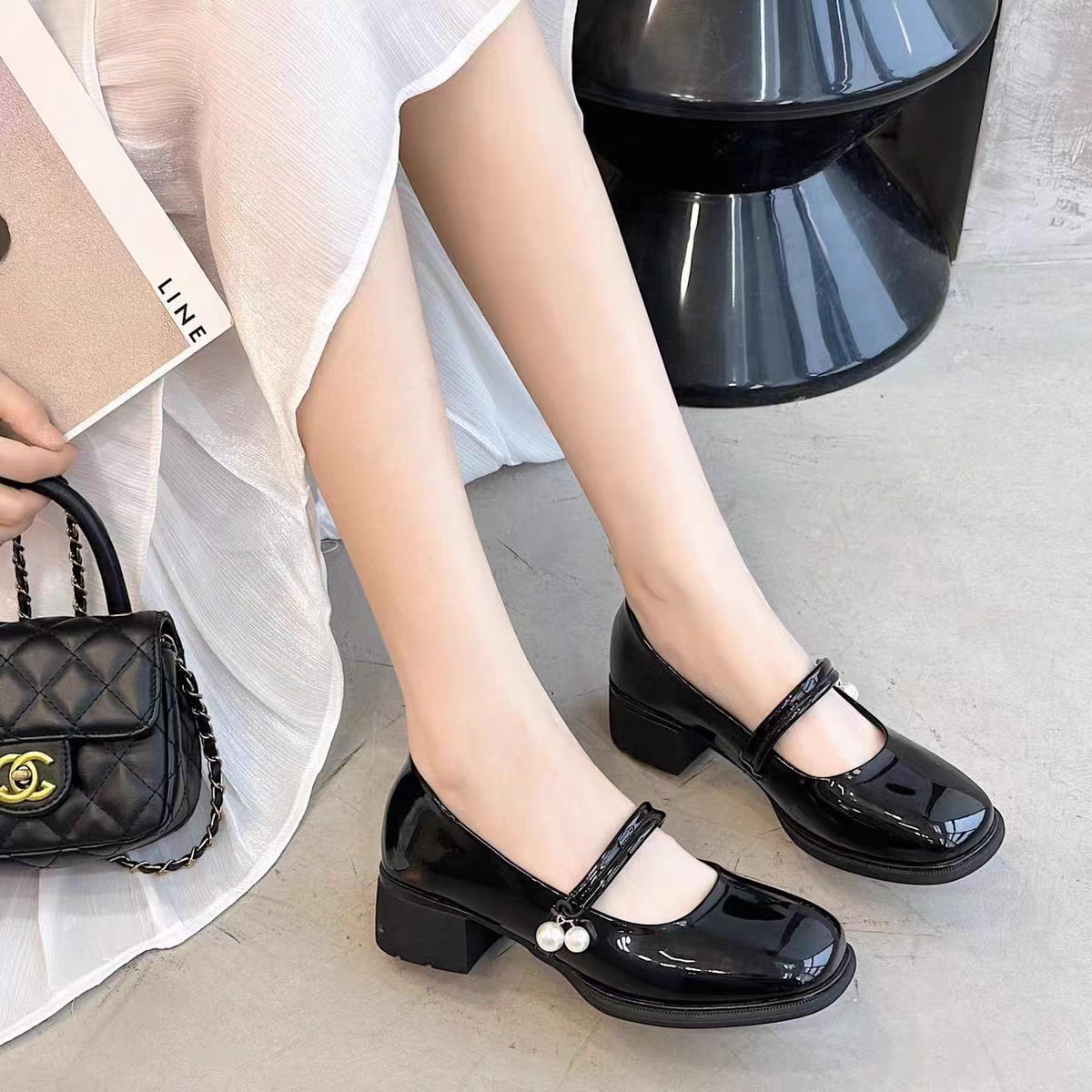 メリージェーンシューズ女性のための 2025 春の新スタイル浅い口パールバックルフェアリースタイル厚いヒール小さな革靴フレンチハイヒール