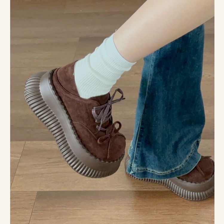 大頭松餅の小さい背の厚い底の茶色の靴2025新型の復古の厚い底のベーケンの小さい靴の女性の美ラード