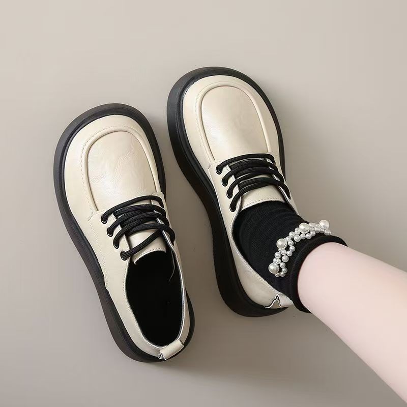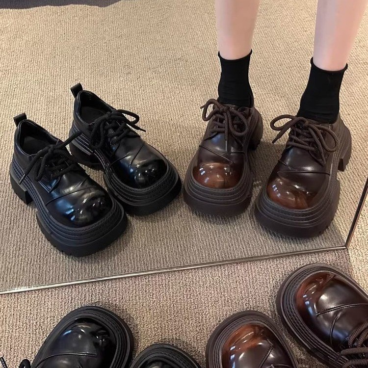 ヨーロッパの商品2025の新型の厚い底JKの楽福の靴の女性の大きい頭の小さい革靴は高くなってファッションの女性の靴のカジュアルな靴を結びます。