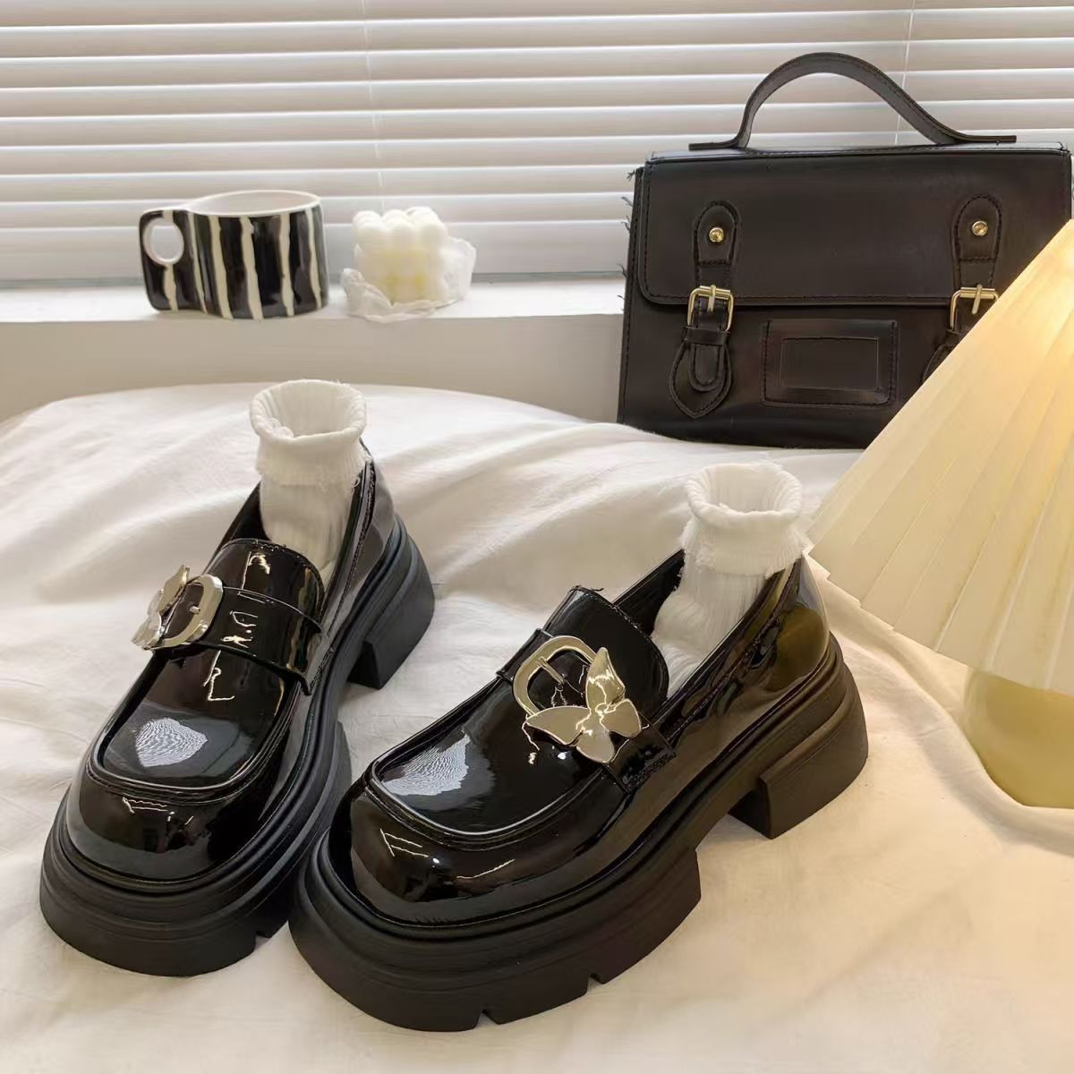 厚い底の黒色の小さい革靴の女性の2025新型の春秋の英倫の風は太いです。