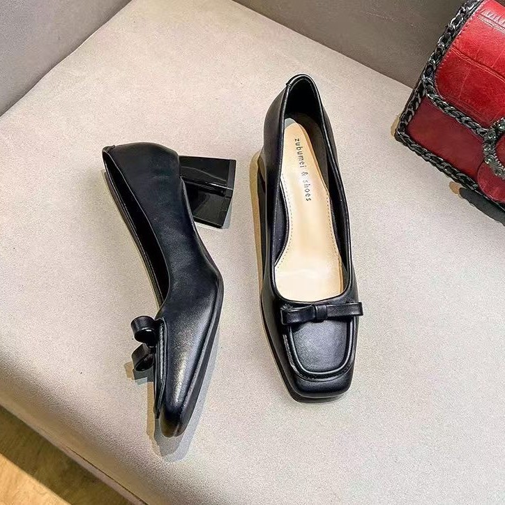 フランスのシンプルで太いハイヒールの女性2025の新型の春のレトロが高くなりました。