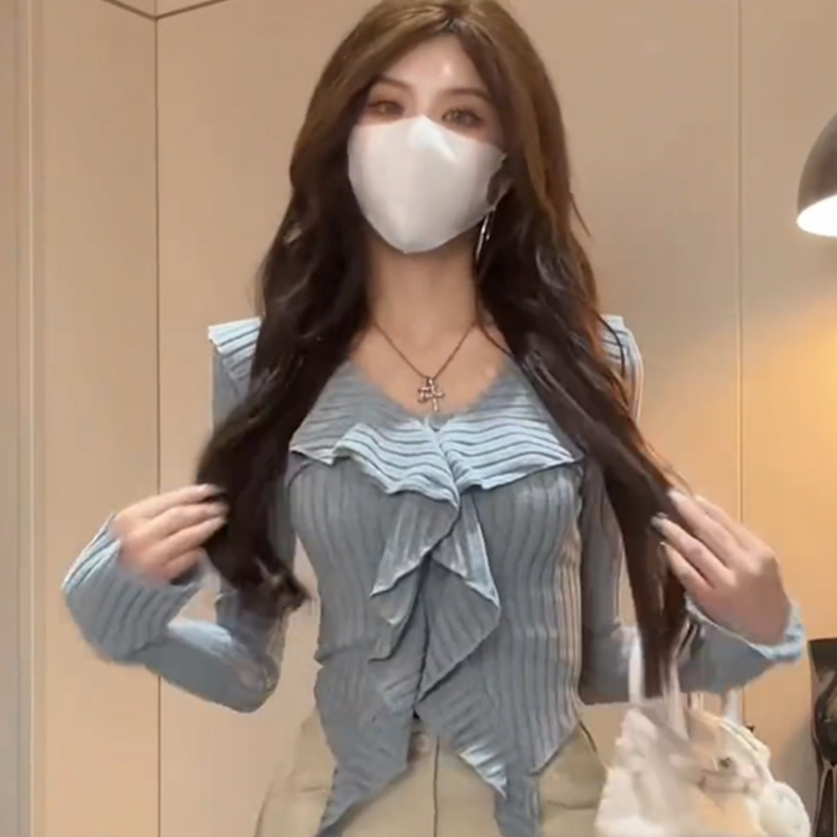 純欲風ギャルvネックラッパ袖長袖tシャツ秋冬不規則メリヤスのフリルのセクシーなシックな上着の女性