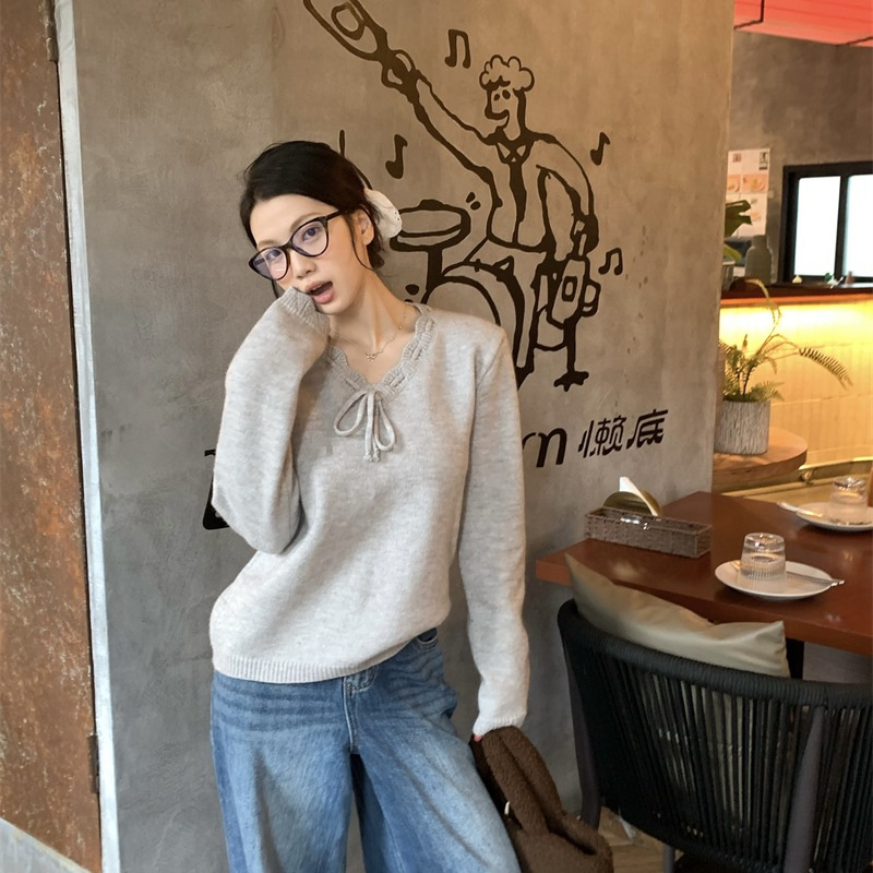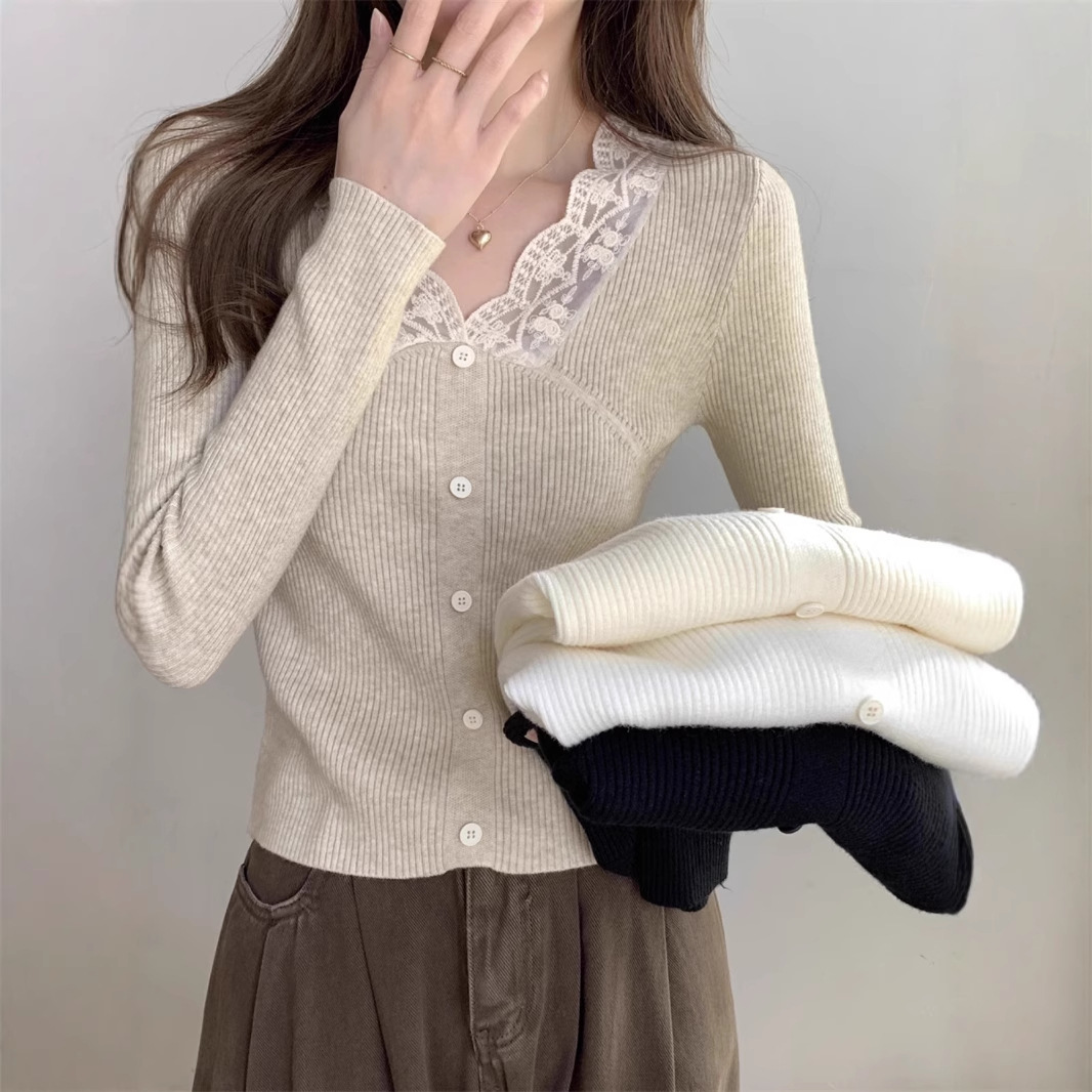 大衆はレースの縁のvネックのニットの長袖のtシャツをつづり合わせます。