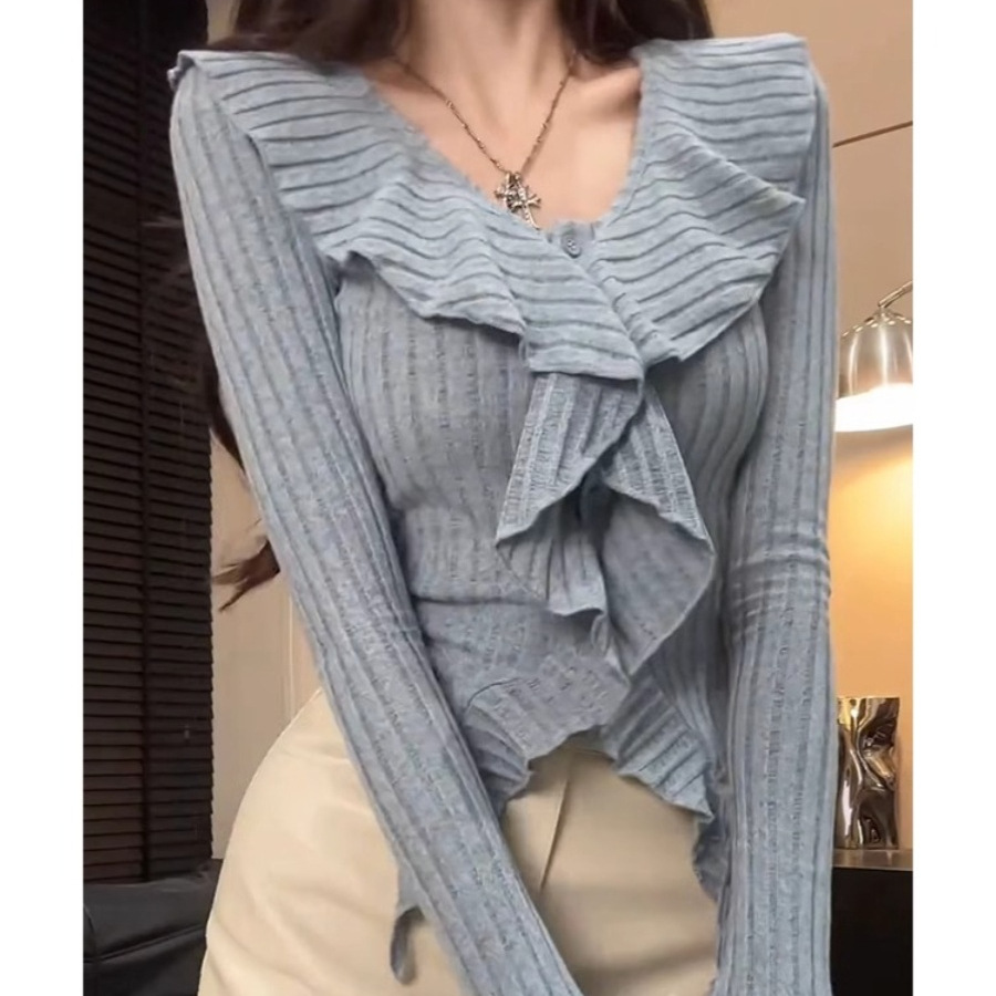 セクシーな純欲風ギャルvネックのラッパの袖の長袖のtシャツの女性の秋冬の不規則なメリヤスのフリルの縁の上着ins