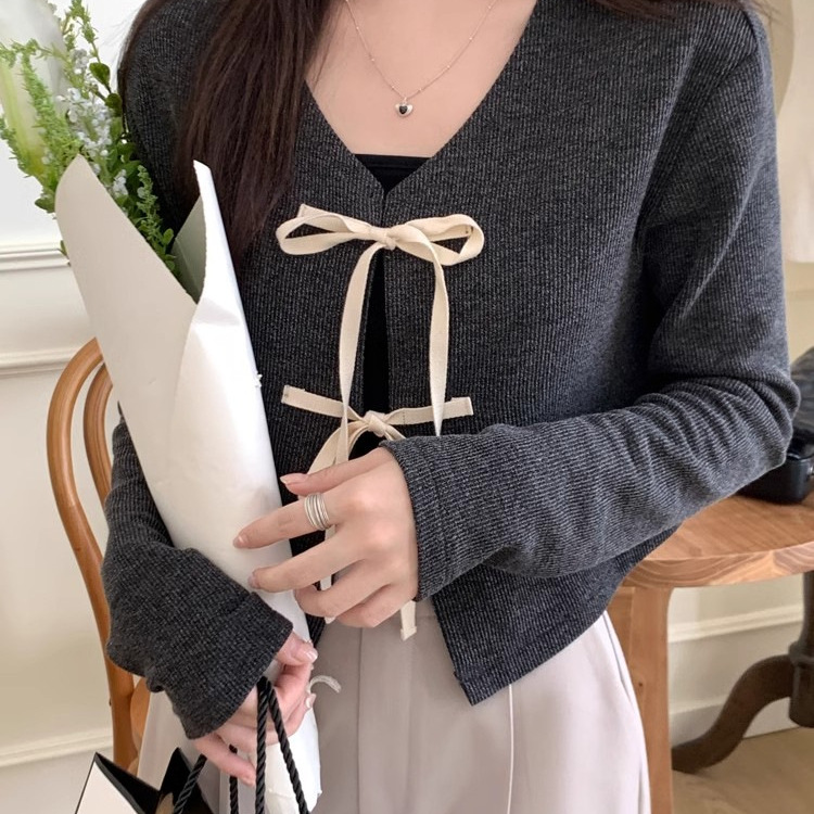 甘い小衆vネックのストラップの長袖ニットカーディガンの女性tシャツのセクシーな純欲の風は身を修めています。