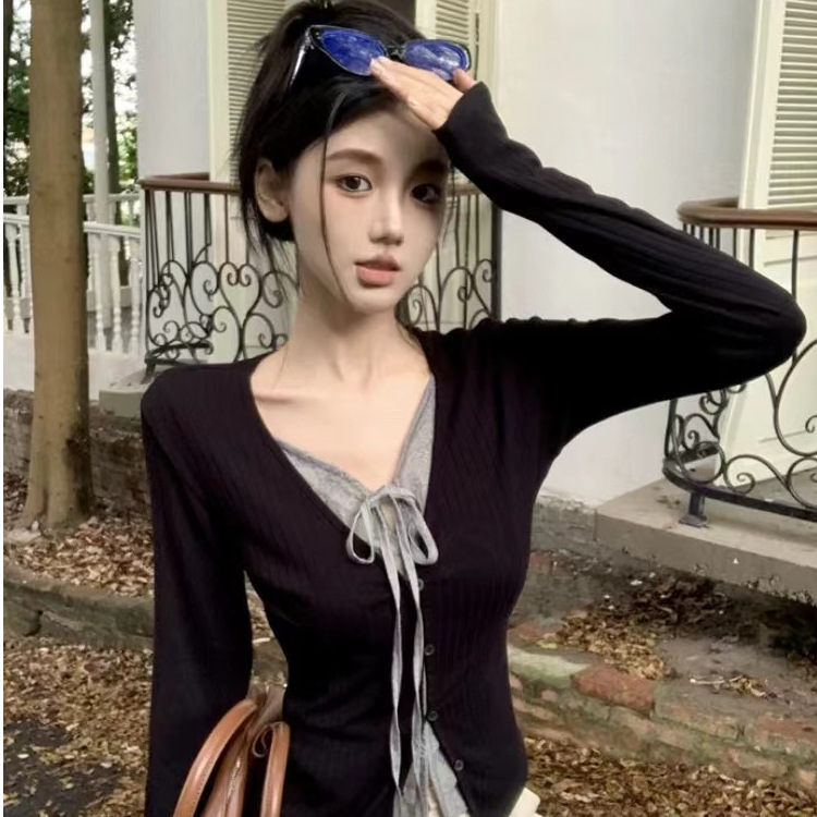 大衆ファッションは偽の長袖tシャツの秋の新型の甘いギャルの修身がやせているデザイン感のvネックの上着をつなぎ合わせます。