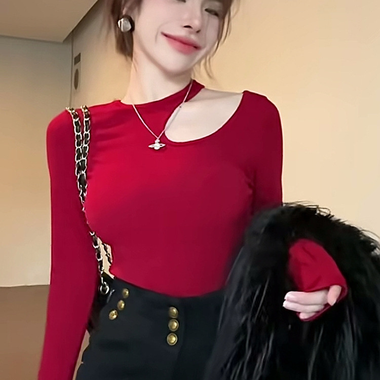 赤いスリムスリムニット女性長袖tシャツ秋冬の鎖骨抜き半高襟ギャルセクシー上着ins