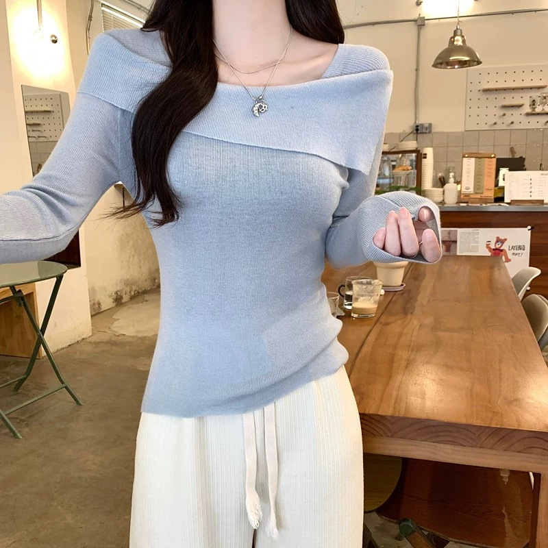 秋の肩のデザイン感長袖ニットtシャツ女性の新商品一字肩の修身が痩せています。