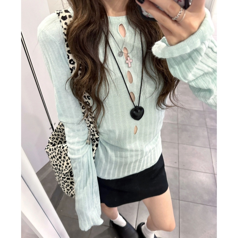 フランスの透かし彫りの修身はやせているニットの長袖のtシャツの早秋の小さい大衆の設計感のギャルが腰を収めて身を修める上着insを修理します。