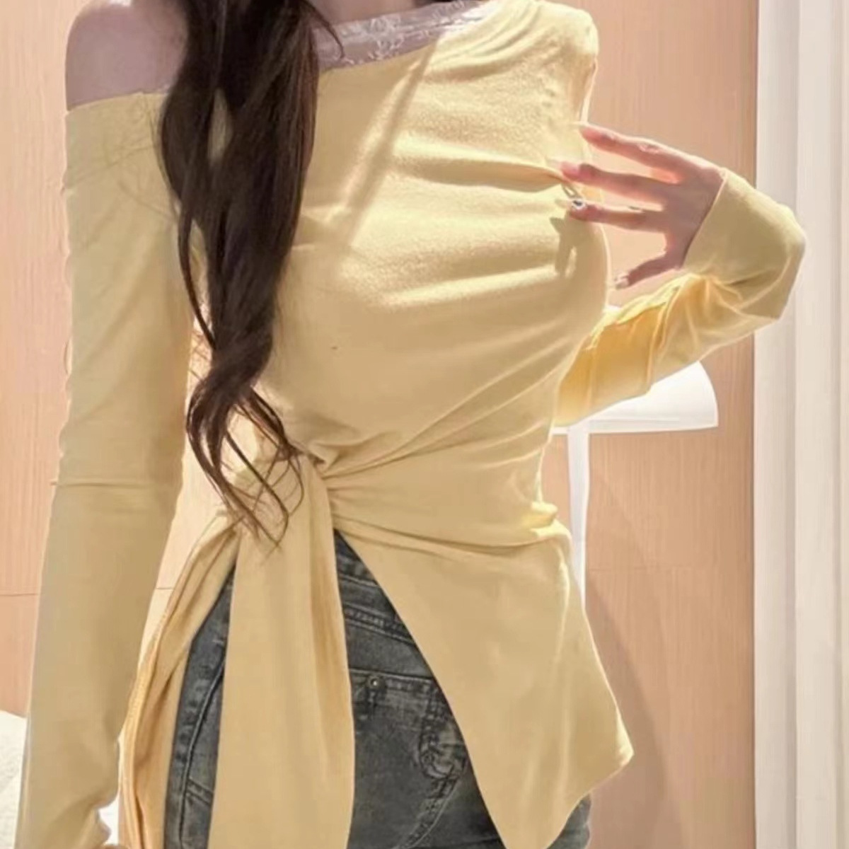 韓国系デザイン感ウエストvネック長袖tシャツ女性ギャルセクシースリム着痩せ早秋純欲風上着ins