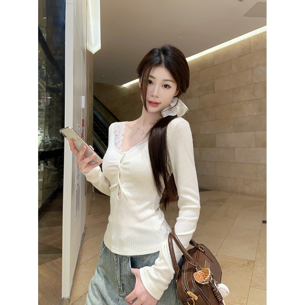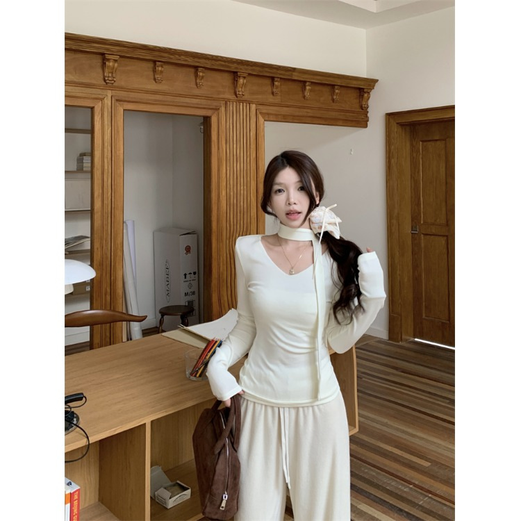 純欲風ギャルセクシーvネック首長袖tシャツ秋冬小香風開叉小衆修身着痩せ上着