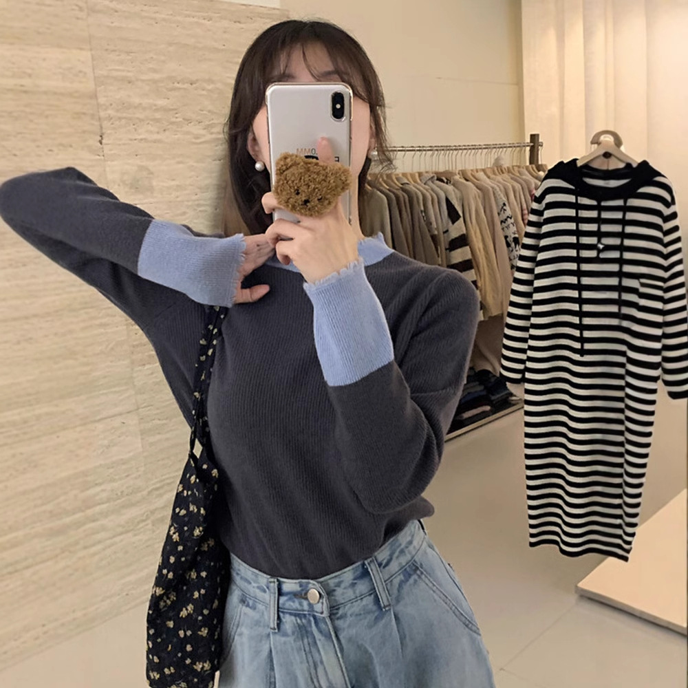 グレーの色の秋の冬の丸襟の頭のニットの長袖のtシャツの2024新型のギャルのセクシーな純欲の上着