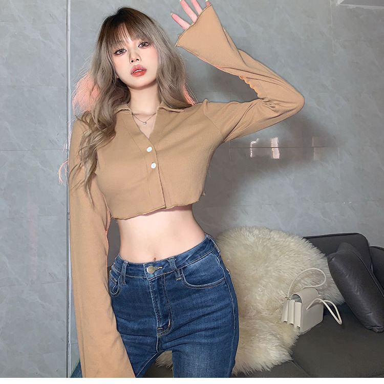 アメリカの秋の新型臍レトロなギャル気質の短いpolo襟長袖tシャツファッション百合上着ins
