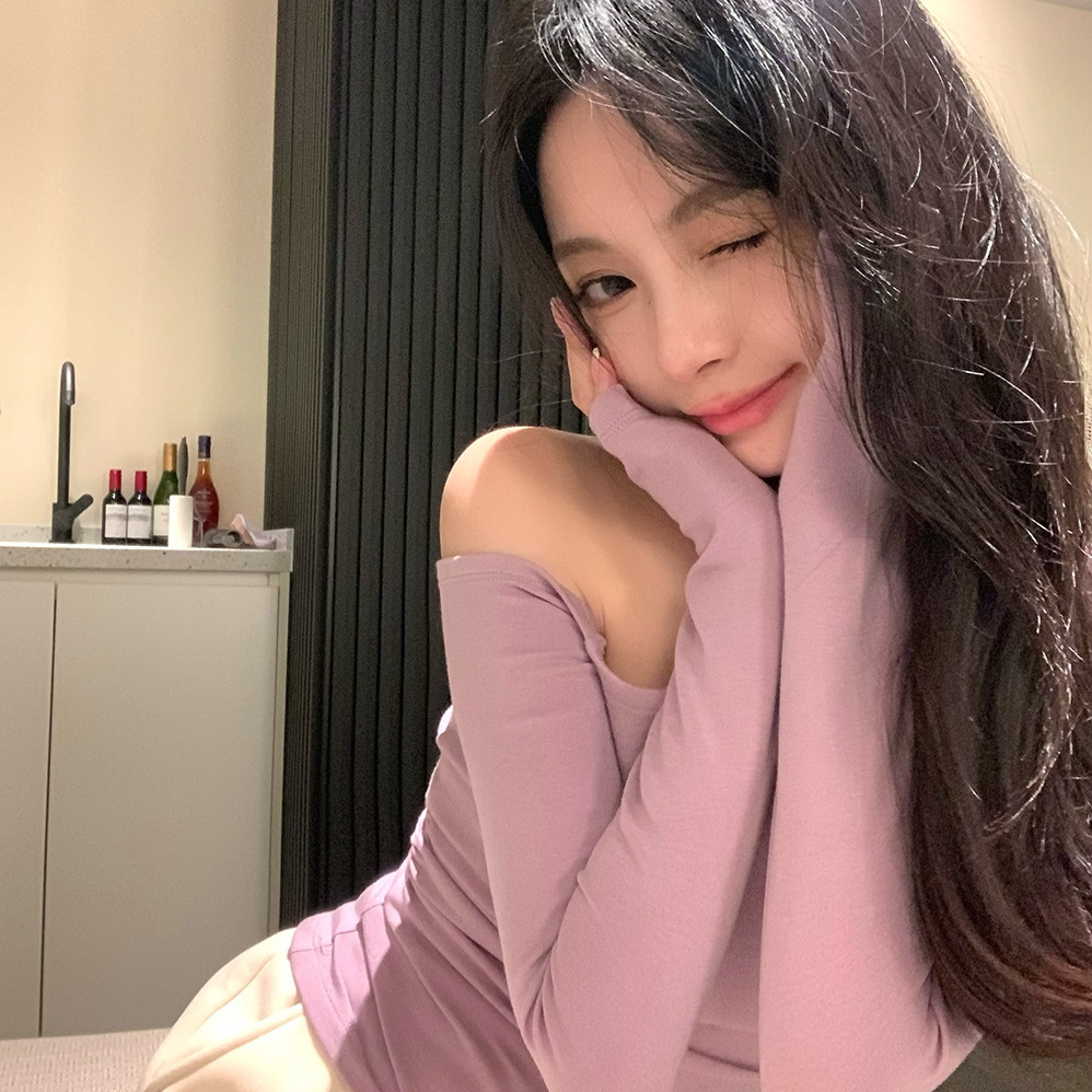2024早秋の新型韓国版デザイン感小衆純欲tシャツ一字肩捻挫色が痩せて見えるニット上着