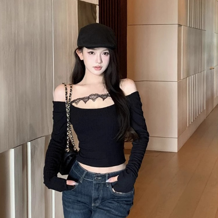 偽の2つの斜めの肩のレースは長袖のtシャツの女性の秋をつづり合わせて身を修めてやせて純粋にセクシーになりたいです。