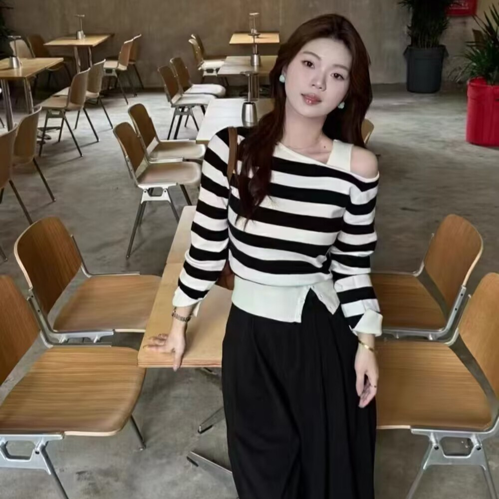2024優しく着て、斜めの肩のストライプのニットの長袖のtシャツを着て、だらだらしています。