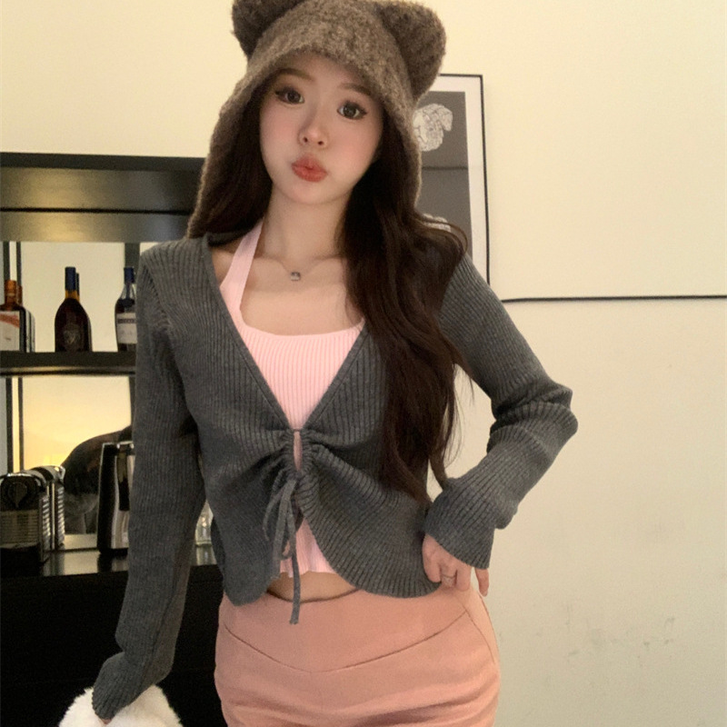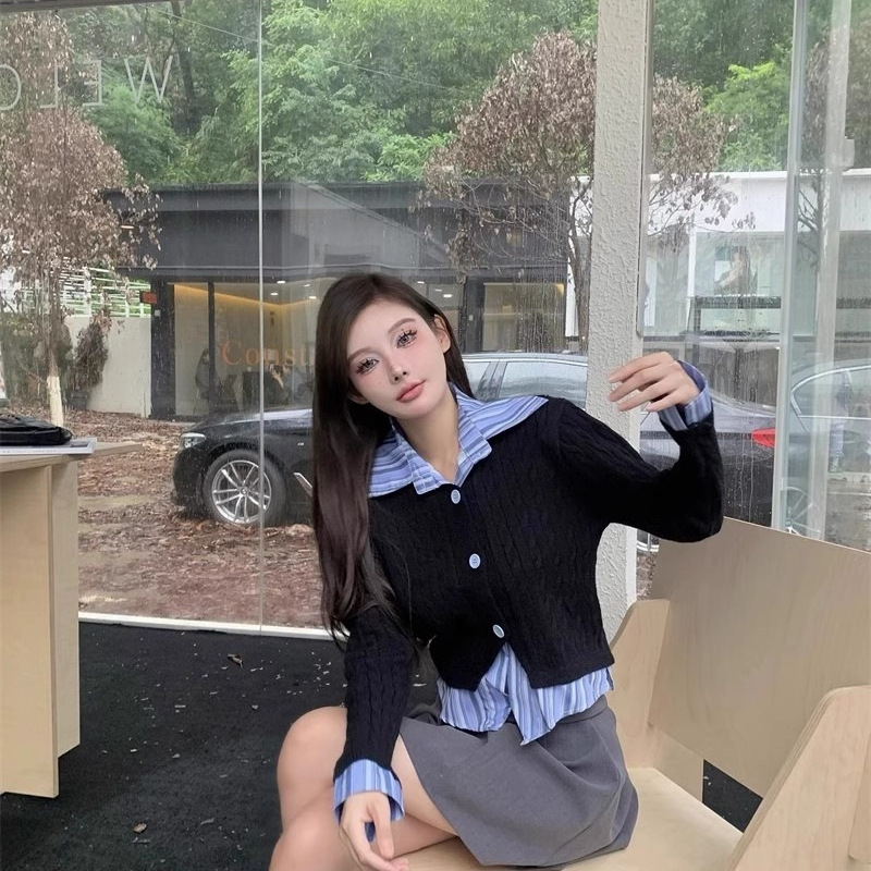偽の2つのステッチニットカーディガンの女性tシャツ秋冬2024の新しいフランスのユニークで甘いセクシーな純粋な上着