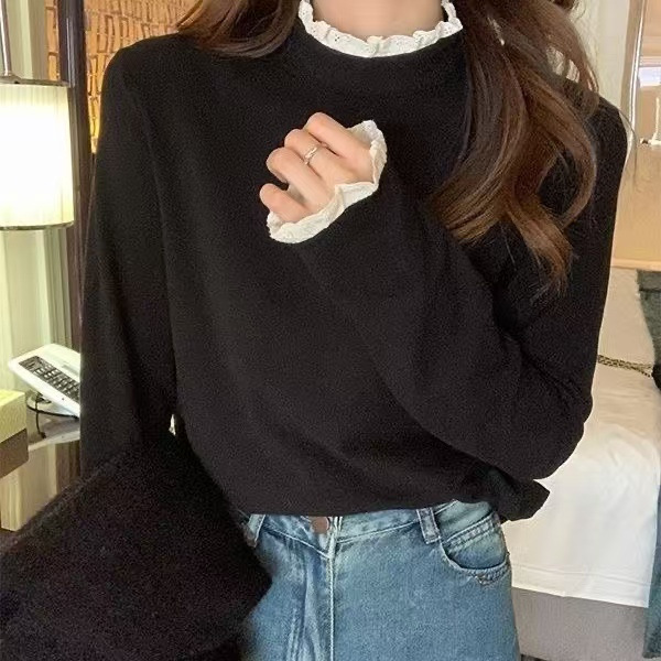 ギャルのセクシーな半高襟の長袖tシャツ2024新型秋冬の木の耳元の純欲風レースの上着