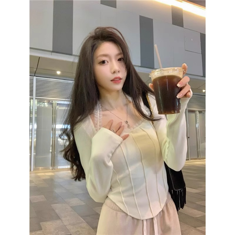 セクシーなギャルの純粋な欲風の秋冬の修身はやせているレースの長袖のtシャツの2024新型のファッションの大衆の上着を現します。